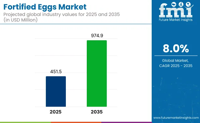 The global fortified eggs market is witnessing strong momentum as consumers increasingly seek functional foods that deliver added health benefits without disrupting everyday diets. According to the latest industry analysis, the market is valued at USD 451.5 million in 2025 and is projected to reach USD 974.9 million by 2035, expanding at a robust 8.0% CAGR over the forecast period.